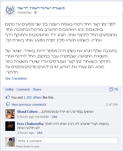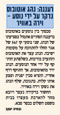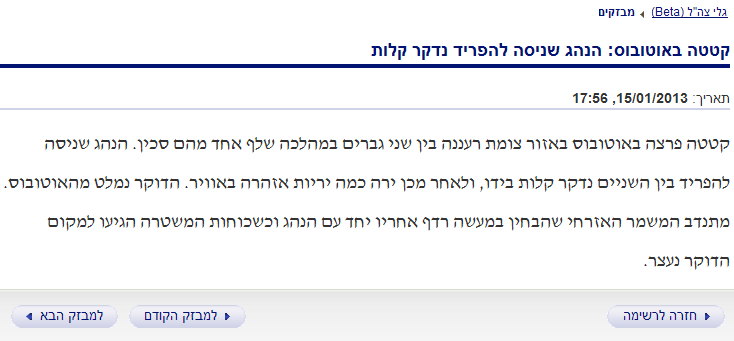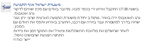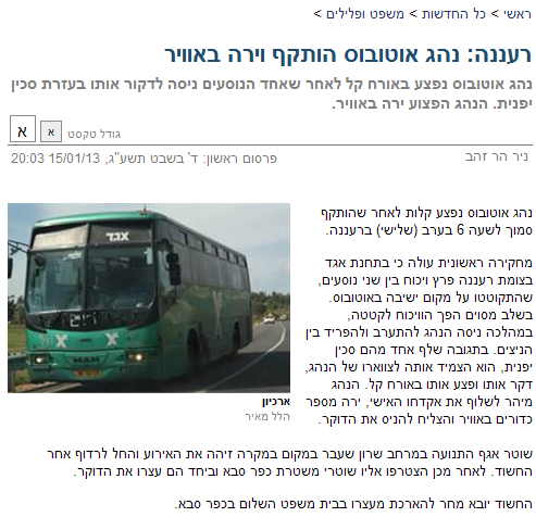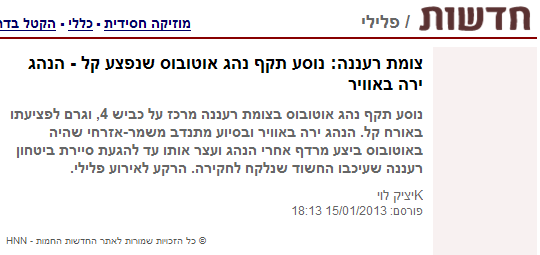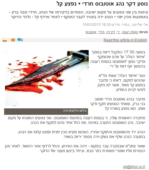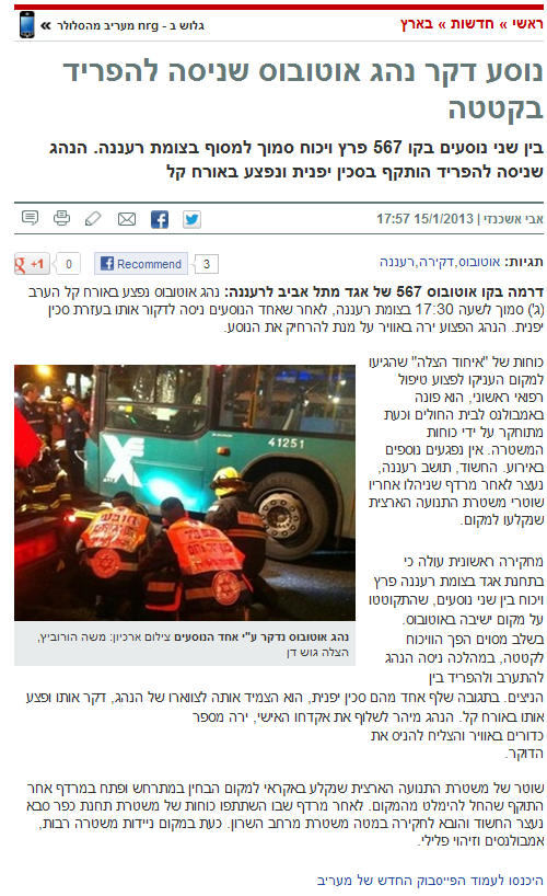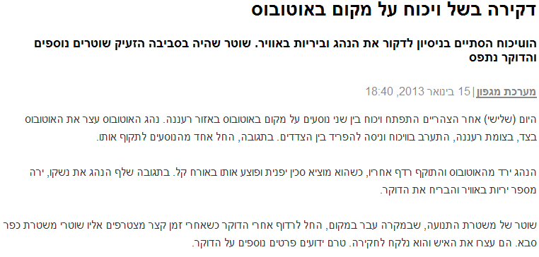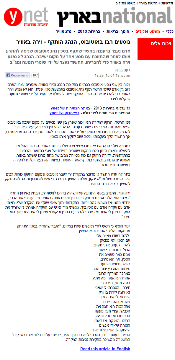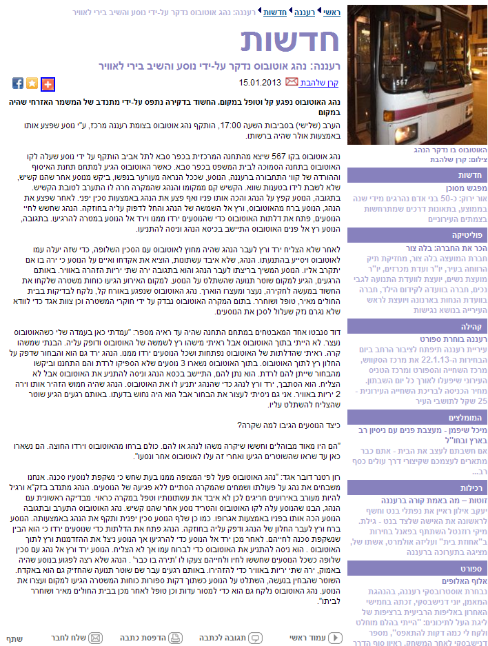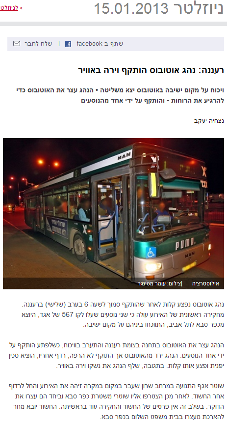 בתאריך 15/01/2013 , הייתי בדרכי למשמרת בשלוחת שרון שממוקמת בתוך מתחם המחוז. בהגיעי לצומת הפניה לכיוון התחנה, ליד התחנה המרכזית כפר סבא, הבחנתי במה שלא יכול להיות מוגדר בשום צורה אחרת, חוץ מאשר ארוע חריג. בעודי עומד ברמזור ומשוחח בטלפון עם חברי אמיר, הפניתי את מבטי ימינה לכיוון התחנה המרכזית וראיתי אזרח עומד על הכביש ומכוון אקדח מעל לראשו של אזרח שני. בקושי הספקתי לפתוח את החלון וכבר שמעתי יריות שחלפו סנטימטרים בודדים מעל ראשו של השני. זינקתי מהרכב, תוך שאני שולף ודורך את אקדחי האישי (ושוכח לכבות ולקחת איתי את מפתחות הרכב) וצמצמתי לכיוון האזרח שאחז באקדח. הנחיתי אותו להניח את נשקו ולמזלי היותי על מדים הקלה את המשימה הזו. אספתי את נשקו ופניתי לטפל באזרח השני שבנתיים הספיק להתרחק מעט מהמקום. מעוברי אורח הבנתי שמדובר באדם שקודם לכן תקף את האזרח היורה וכעת מנסה להימלט מהמקום. בעודו אוחז בסכין, ניסיתי לדובב אותו ולשכנע אותו להניח את הסכין על מנת שלא יאונה לו כל רע. בשלב מסויים התחילו להגיע כוחות מהתחנה ולמשמע הסירנות פתח הסכינאי במנוסה, מעד בנסיון לקפוץ מעל לגדר הבטחון שבמרכז הכביש וכשהוסחה דעתו ניצלתי את ההזדמנות לבעוט בידו ולנטרל אותו מנשקו. לאחר מספר שניות הוא כבר היה באזיקים ואני ביליתי את שארית המשמרת בתחקיר עם ורה החוקרת המצויינת של תחנת כפר סבא. למטה ניתן להתרשם מההתעניינות התקשורתית בארוע.